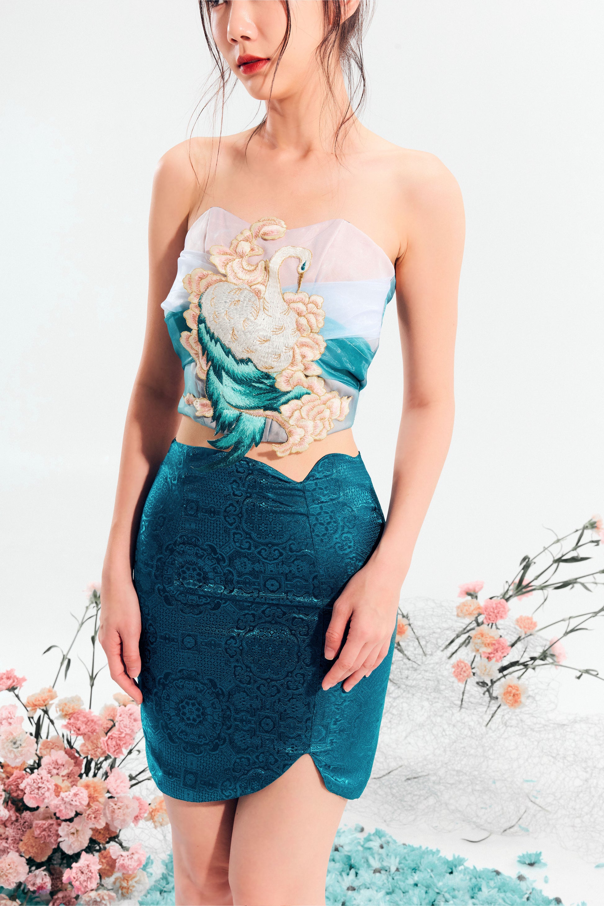 The model is 174cm tall, wearing size XS for tops and size M for bottoms. For dresses, she wears size M, tailored to her measurements for the photoshoot.